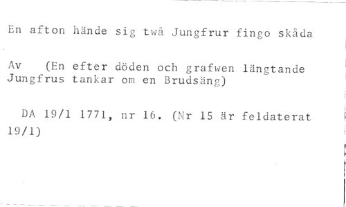En afton hände sig twå Jungfrur fingo skåda //// Av (En efter döden och grafwen längtande //// Jungfrus tankar om en Brudsäng) //// DA 19/1 1771, nr 16. (Nr 15 är feldaterat 19/1)