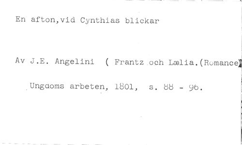 En afton,vid Cynthias blickar //// Av J.E. Angelini ( Frantz och Laslia.(Romancel //// Unggoms arbeten, 1801, s. d8 - 9b.