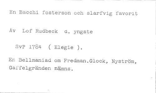 En Bacchi fosterson och slarfvig favorit //// Av Lof Rudbeck d. yngste SvP 1784 ( Elegie ). //// En Bellmaniad om Fredman.Glock, Nyström, Gaffelgränden nämns.