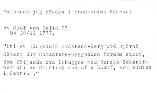 En Bonde jag föddes i Stockholms Råd-sal //// Av Olof von Dalin ?? DA 20/12 1777. //// "Uti et långslutt Gråstens-Berg wid Björnö Säteri där Caracters-Byggnaden fordom stådt, //// äro följande ord inhuggne med Runska Bokstäfwer uti en Ormsling sna af 9 hwarf, som slutas //// i Centrum."