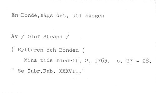 En Bonde,sägs det, uti skogen //// Av / Olof Strand //// /( Ryttaren och Bonden ) //// Mina tids-fördrif, 2, 1763, s. 27 - 28. " Se Gabr.Fab. XXXVII."