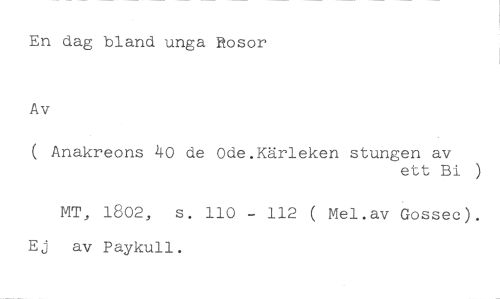 En dag bland unga Rosor //// Av //// ( Anakreons 40 de Ode.Kärleken stungen av //// ett Bi ) //// MT, 1802, s. 110 - 112 ( Mel.av Gossec). Ej av Paykull.