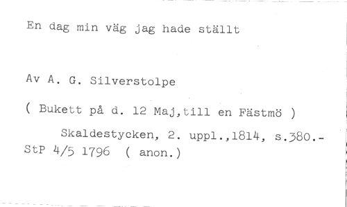 En dag min väg jag hade ställt //// Av A. G. Silverstolpe //// ( Bukett på d. 12 Maj,till en Fästmö ) //// Skaldestycken, 2. uppl.,1814, s.380.-St? 4/5 1796 ( anon.)