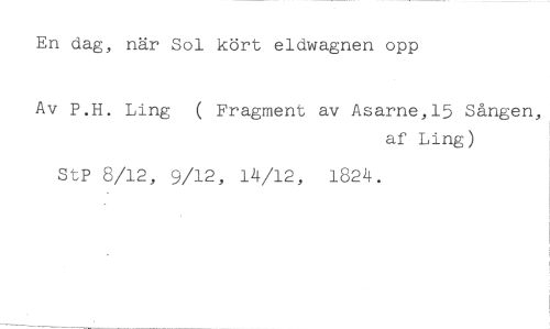 En dag, när Sol kört eldwagnen opp //// Av P.H. Ling ( Fragment av Asarne,15 Sången, //// af Ling) //// StP 8/12, 9/12, 14/12, 1824.