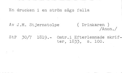 En drucken i en ström sågs falla //// Av J.M. Stjernstolpe ( Drinkaren ) //// /Anon. //// /stp 3o/7 1819.- Omtr.i Efterlemnade skrif- //// ter, 1833, s. 100.