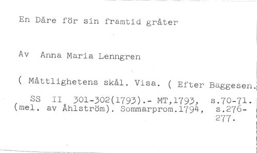 En Dåre för sin framtid gråter //// Av Anna Maria Lenngren //// ( Måttlighetens skål. Visa. ( Efter Baggesen. //// SS 1I 301-302(1793).- MT,1793, s.70-71. s.276- //// (mel. av Åhlström). Sommarprom.179k, 277.