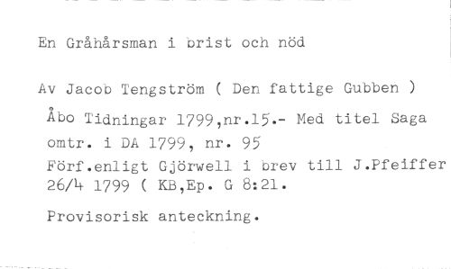 En Gråhårsman i brist och nöd //// Av Jacob Tengström ( Den fattige Gubben ) //// Åbo Tidningar 1799,nr.15.- Med titel Saga omtr. i DA 1799, nr. 95 //// Förf .enligt Gjörwell i brev till J.Pfeiffer 26/4 1799 ( KB,Ep. G 8:21. //// Provisorisk anteckning.