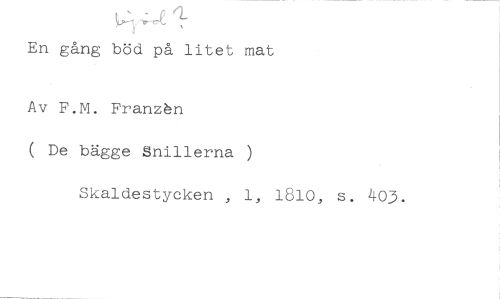 , , //// En gång böd på litet mat //// Av F.M. Franzén //// ( De bägge Snillerna ) //// Skaldestycken , 1, 1810, s. 403.