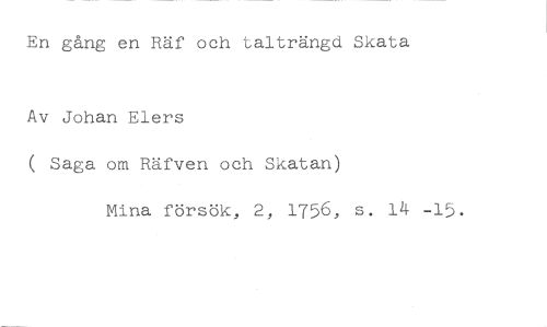 En gång en Räf och talträngd Skata //// Av Johan Elers //// ( Saga om Räfven och Skatan) //// Mina försök, 2, 1756, s. 14 -15.