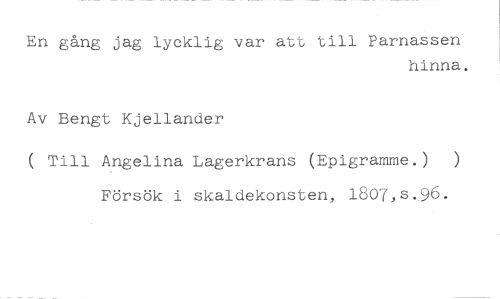 En gång jag lycklig var att till Parnassen //// hinna. //// Av Bengt Kjellander //// ( Till Angelina Lagerkrans (Epigramme.) ) Försök i skaldekonsten, 1807,s.96.
