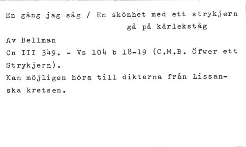 En gång jag såg / En skönhet med ett strykjern //// gå på kärlekståg //// Av Bellman //// Cn III 349. - Vs 104 b 18-19 (C.M.B. Öfwer ett Strykjern). //// Kan möjligen höra till dikterna från Lissanska kretsen.