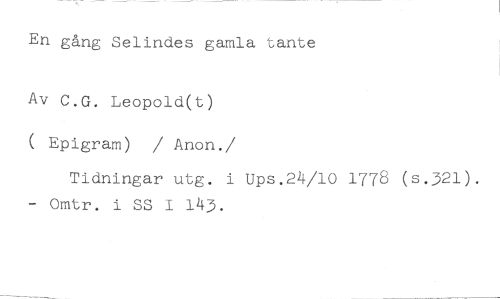 En gång Selindes gamla tante //// Av C.G. Leopold(t) //// ( Epigram) / Anon. //// /Tidningar utg. i Ups.24/10 1778 (s.321). Omtr. i SS I 143.
