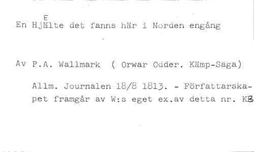 E //// En Hjälte det fanns här i Norden engång //// Av P.A. Wallmark ( Orwar Odder. Kämp-Saga) //// Allm. Journalen 18/8 1813. - Författarskapet framgår av W:s eget ex.av detta nr. Kla