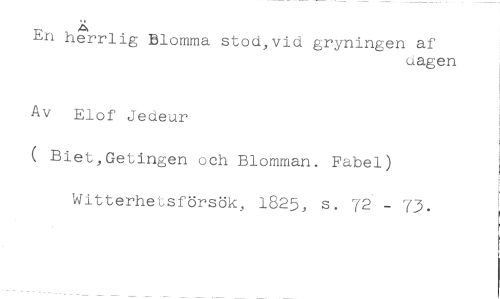Ä //// En her rlig Blomma stod,vid gryningen af //// dagen //// Av Elof Jedeur //// ( Biet,Getingen och Blomman. Fabel) Witterhetsförsök, 1825, s. 72 - 73.