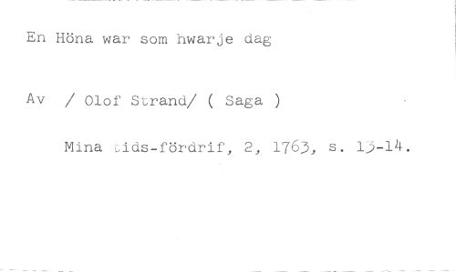 En Höna war som hwarje dag //// Av / Olof Strand/ ( Saga ) //// Mina tids-fördrif, 2, 1763, s. 15-14.