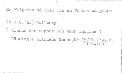 En Krigsman så bold och en Fröken så grann //// Av A.C.(af) Kullberg //// ( Alonzo den tappre och skön Imogine ) //// Läsning i blandade ämnen,Nr 25/26,1799,s. //// 116-120.