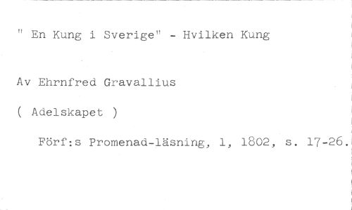 " En Kung i Sverige" - Hvilken Kung //// Av Ehrnfred Gravallius ( Adelskapet ) //// Förf:s Promenad-läsning, 1, 1802, s. 17-26.
