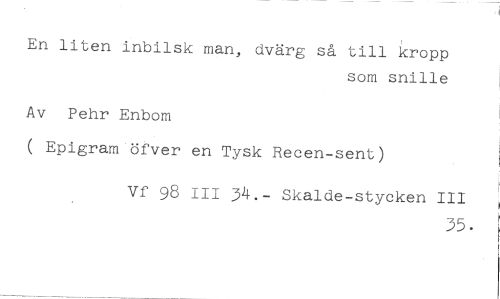 En liten inbilsk man, dvärg så till kropp //// som snille //// Av Pehr Enbom //// ( Epigram öfver en Tysk Recen-sent) //// Vf 98 III 34.- Skalde-stycken III //// 35•