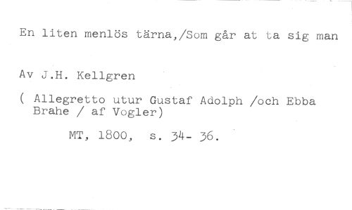 En liten menlös tärna,/Som går at ta sig man Av J.H. Kellgren //// ( Allegretto utur Gustaf Adolph /och Ebba Brahe / af Vogler) //// MT, 1800, s. 34- 36.