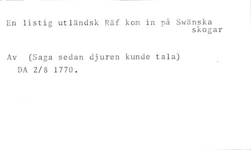 En listig utländsk Räf kom in på Swänska //// skogar //// Av (Saga sedan djuren kunde tala) DA 2/8 1770.