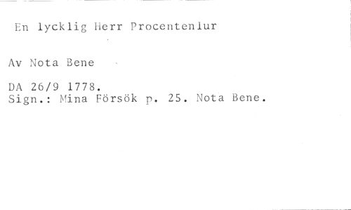 En lycklig Herr Procentenlur //// Av Nota Bene //// DA 26/9 1778. //// Sign.: Mina Försök p. 25. Nota Bene.
