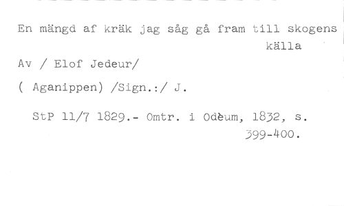 En mängd af kräk jag såg gå fram till skogens //// källa //// Av / Elof Jedeur //// /( Aganippen) /Sign.:/ J. //// StP 11/7 1829.- Omtr. i Odhum, 1832, s. //// 399-400.