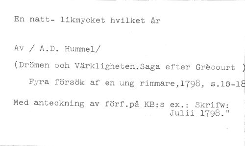 En natt- likmycket hvilket år //// Av / A.D. Hummel //// /(Drömen och Värkligheten.Saga efter Grbcourt Fyra försök af en ung rimmare,1798, s.10-1 //// Med anteckning av förf.på KB:s ex.: Skrifw: //// Julii 1798."