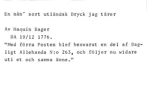 En nån' sort utländsk Dryck jag tärer //// Av Haquin Bager //// DA 19/12 1776. //// "Med förra Posten blef beswarat en del af Dagligt Allehanda N:o 263, och följer nu widare uti et och samma ämne."