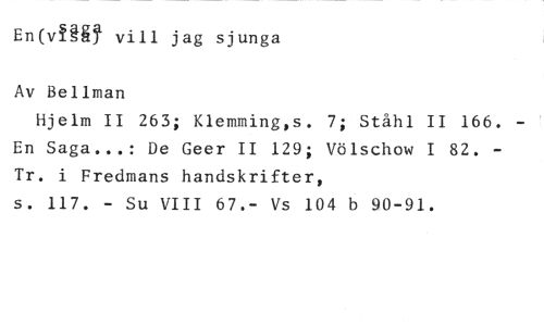 En(dgåY vill jag sjunga //// Av Bellman //// Hjelm II 263; Klemming,s. 7; Ståhl II 166. En Saga...: De Geer II 129; Völschow I 82. Tr. i Fredmans handskrifter, //// s. 117. - Su VIII 67.- Vs 104 b 90-91.