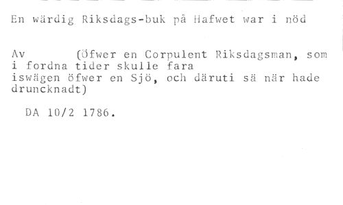 En wärdig Riksdags-buk på Hafwet war i nöd //// Av (Öfwer en Corpulent Riksdagsman, som //// i fordna tider skulle fara //// iswägen öfwer en Sjö, och däruti sä när hade druncknadt) //// DA 10/2 1786.
