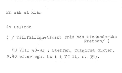En sak så klar Av Bellman //// ( / Tillfällighetsdikt från den Lissanderska //// kretsen/ ) //// SU VIII 90-91 ; Steffen, Outgifna dikter, s.4o efter egh. hs ( ( Vf 11, s. 95).