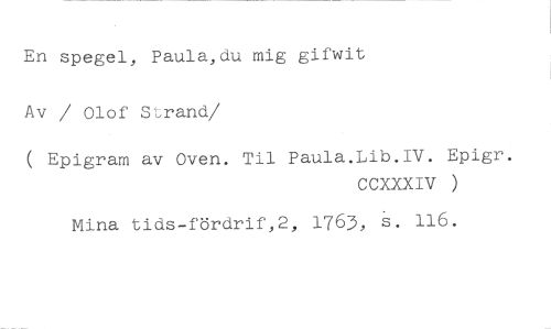 En spegel, Paula,du mig gifwit Av / Olof Strand //// /( Epigram av Oven. Til Paula.Lib.IV. Epigr. //// CCXXXIV ) //// Mina tids-fördrif,2, 1763, s. 116.
