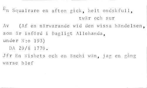 En Squalrare en afton gick, helt ondskfull, //// twär och sur //// Av (Af en närwarande wid den wissa händelsen, //// som är införd i Dagligt Allehanda, //// under N:o 193) //// DA 29/8 1770, //// Jfr En Wishets och en Bachi wän, jag en gång varse blef
