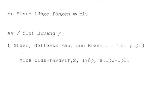 En Stare länge fången warit //// Av / Olof Strand //// /( Göken, Gellerts Fab. und Erzehl. I Th. p.31) //// Mina tids-fördrif,2, 1763, s.130-131.