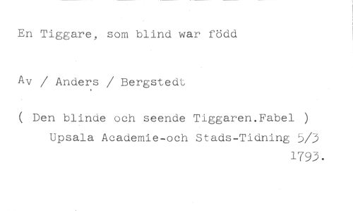 En Tiggare, som blind war född //// Av / Anders / Bergstedt //// ( Den blinde och seende Tiggaren.Fabel ) //// Upsala Academie-och Stads-Tidning 5/3 //// 1793.