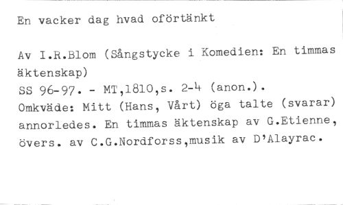 En vacker dag hvad oförtänkt //// Av I.R.Blom (Sångstycke i Komedien: En timmas äktenskap) //// SS 96-97. - MT,1810,s. 2-4 (anon.). //// Omkväde: Mitt (Hans, Vårt) öga talte (svarar) annorledes. En timmas äktenskap av G.Etienne, övers. av C.G.Nordforss,musik av D'Alayrac.