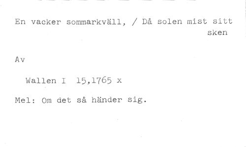 En vacker sommarkväll, / Då solen mist sitt //// sken //// Av //// Wallen I 15,1765 x //// Mel: Om det så händer sig.