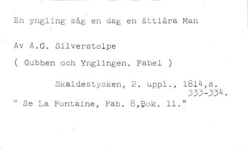 En yngling såg en dag en åttiåra Man //// Av A.G. Silverstolpe //// ( Gubben och Ynglingen. Fabel ) //// Skaldestycken, 2. uppl., 1814,s. //// 333-334. //// " Se La Fontaine, Fab. 8,$ok. 11."