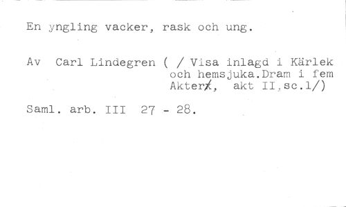 En yngling vacker, rask och ung. //// Av Carl Lindegren ( / Visa inlagd i Kärlek //// och hemsjuka.Dram i fem AkterÅ, akt II,sc.l/) //// Saml. arb. III 27 - 28.
