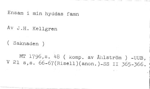 Ensam i min hyddas famn Av J.H. Kellgren ( Saknaden ) //// MT 1796,s. 48 ( komp. av Åhlström ) -UUB, V 21 s,s. 66-67(Risell)(anon.)-SS II 365-366.