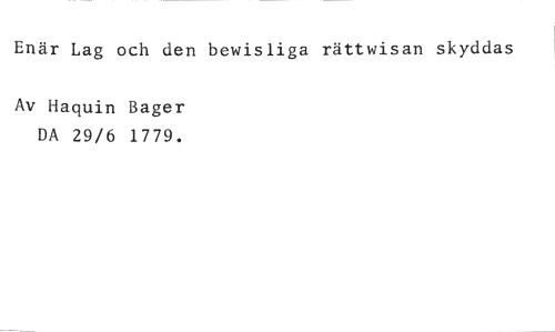 Enär Lag och den bewisliga rättwisan skyddas //// Av Haquin Bager DA 29/6 1779.