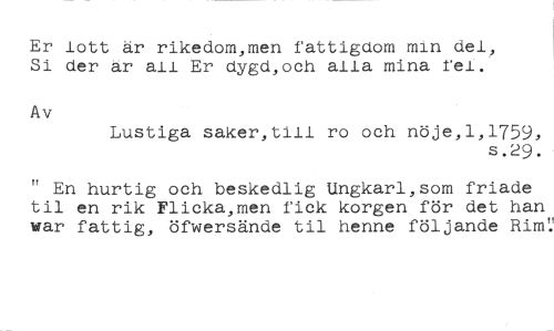 Er lott är rikedom,men fattigdom min del, Si der ar all Er dygd,och alla mina rel. //// Av //// Lustiga saker,till ro och nöje,1,1759, //// s.29. //// " En hurtig och beskedlig Ungkarl,som friade til en rik Flicka,men fick korgen för det han war fattig, öfwersände til henne följande Rim':