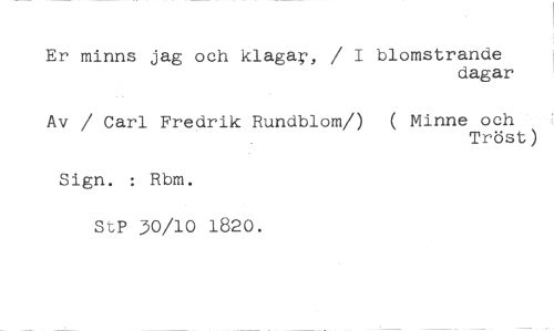 Er minns jag och klaga', / I blomstrande //// dagar //// Av / Carl Fredrik Rundblom/) ( Minne och //// Tröst) //// Sign. : Rbm. //// StP 30/10 1820.