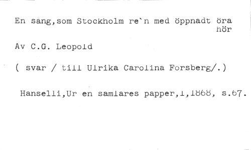En sang,som Stockholm re'n med öppnadt öra //// hör //// Av C.G. Leopold //// ( svar / till Ulrika Carolina Forsberg/.) //// Hanselli,Ur en samlares papper,l,1ö65, s.b7.