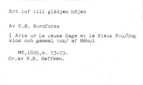 Ert lof till glädjen höjen Av C.G. Nordforss //// ( Aria ur Le Jeune Sage et le Vieux Fou/Ung klok och gammal tok/ af Mhul //// MT,1805,s. 73-79. Or.av F.B. Hoffman.