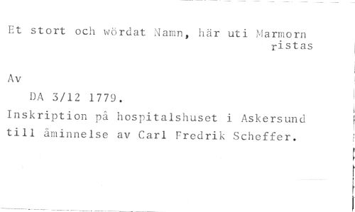 Et stort och wördat Namn, här uti Marmorn //// ristas //// Av //// DA 3/12 1779. //// Inskription på hospitalshuset i Askersund till åminnelse av Carl Fredrik Scheffer.