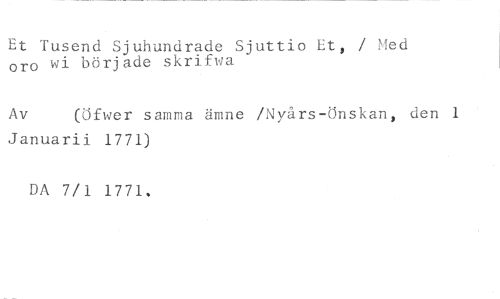 Et Tusend Sjuhundrade Sjuttio Et, / Med oro wi började skrifwa //// Av (Öfwer samma ämne /Nyårs-Önskan, den 1 //// Januarii 1771) //// DA 7/1 1771.