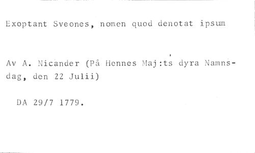 Lxoptant Sveones, nomen quod denotat ipsum //// Av A. Nicander (På Hennes Maj:ts dyra Namnsdag, den 22 Julii) //// DA 29/7 1779.