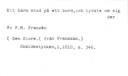 Ett barn stod på ett bord,och tyckte om sig //// der //// Av F.M. Franzén //// ( Den Store.( från Franskan.) Skaldestycken,1,1810, s. 346.