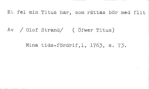 Et fel min Titus har, som rättas bör med flit //// Av / Olof Strand/ ( öfwer Titus) //// Mina tids-fördrif,l, 1763, s. 73.
